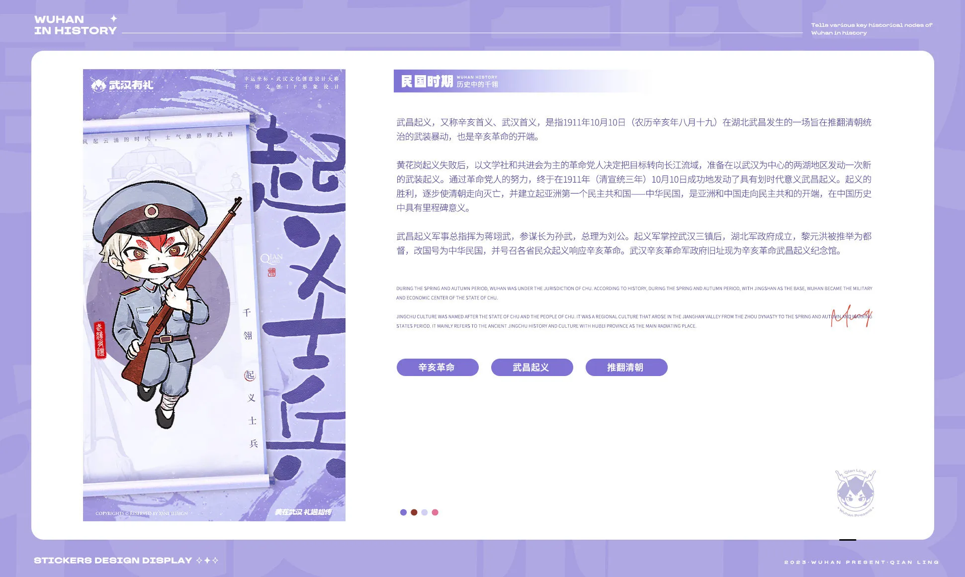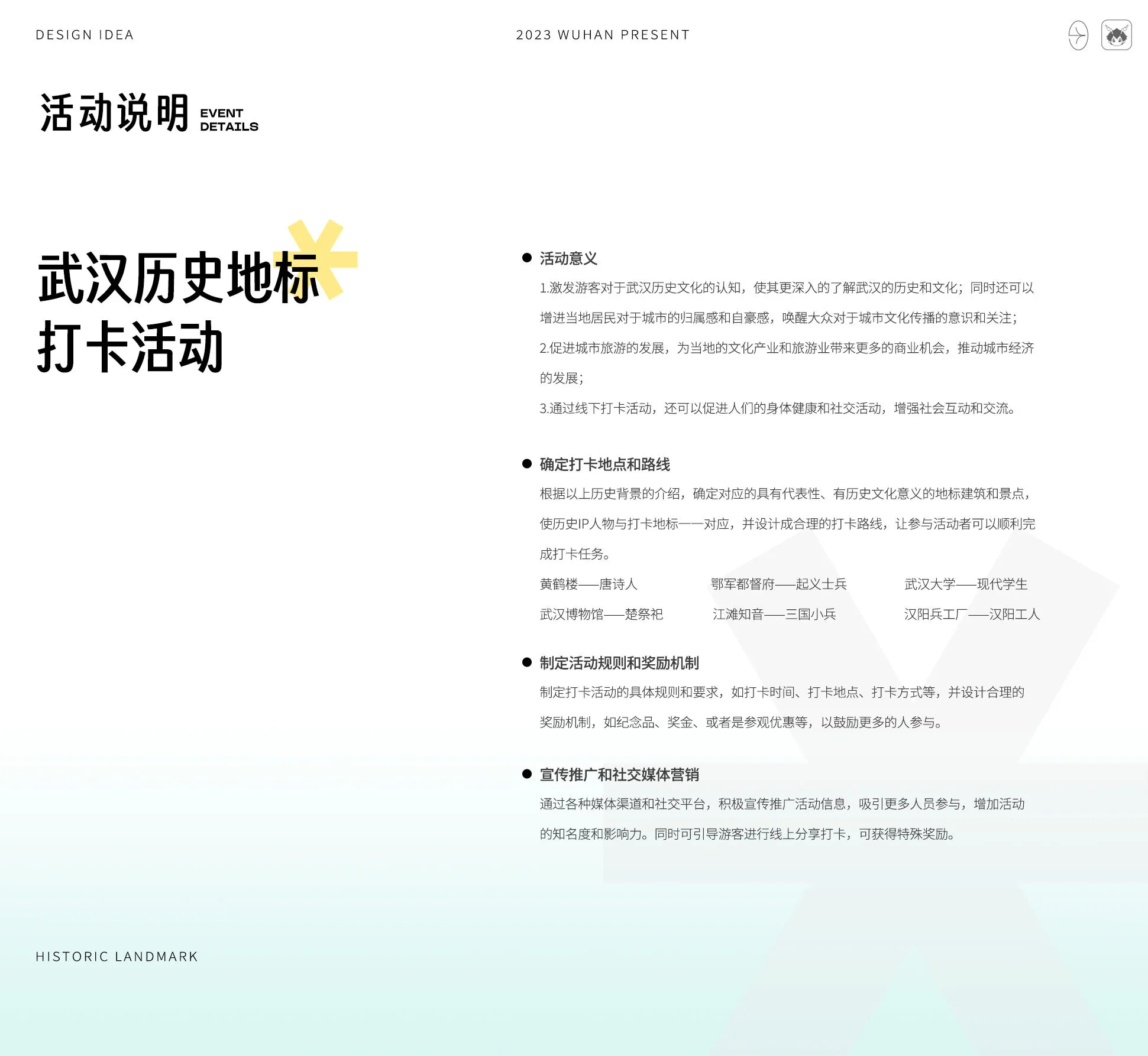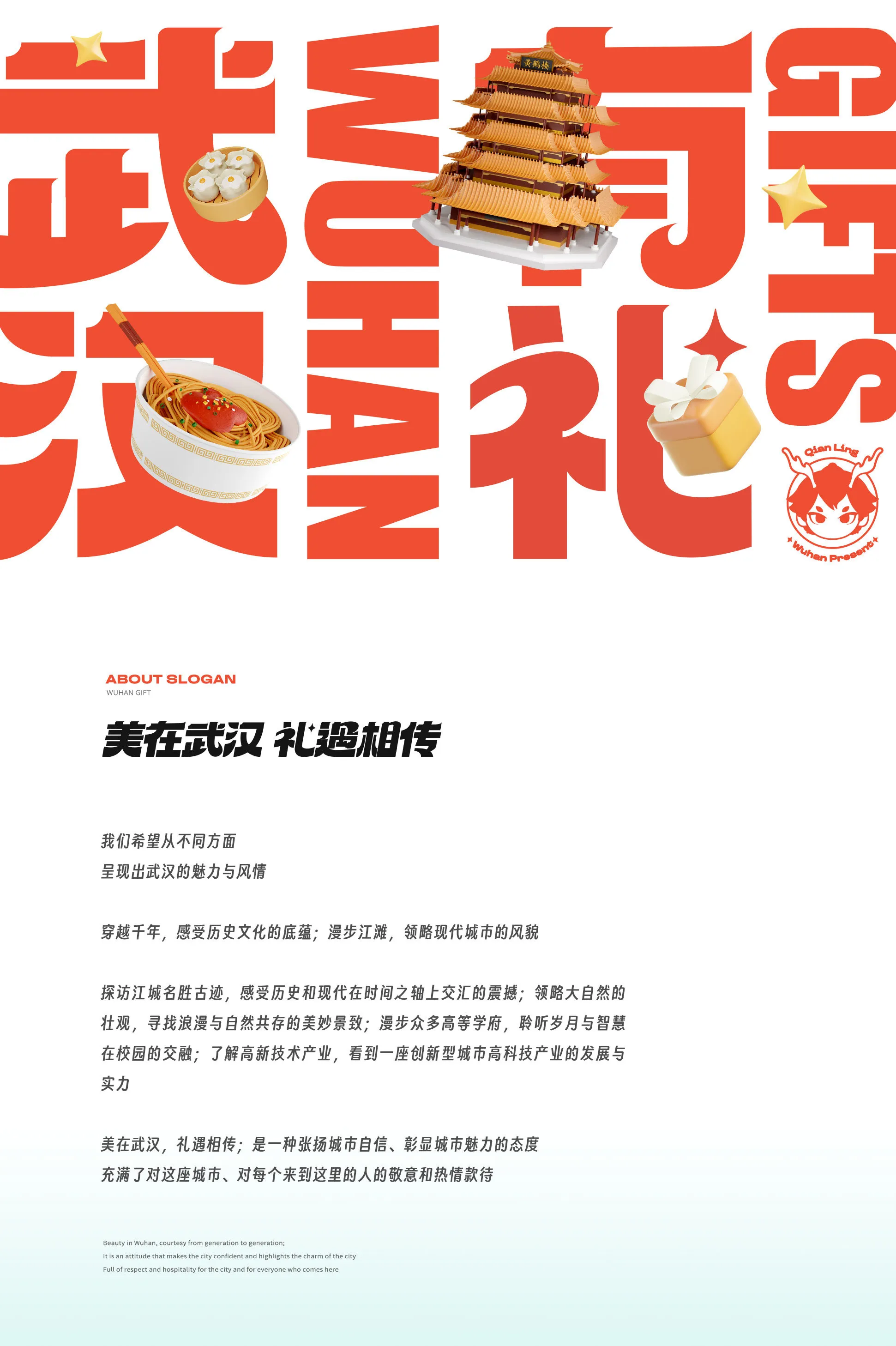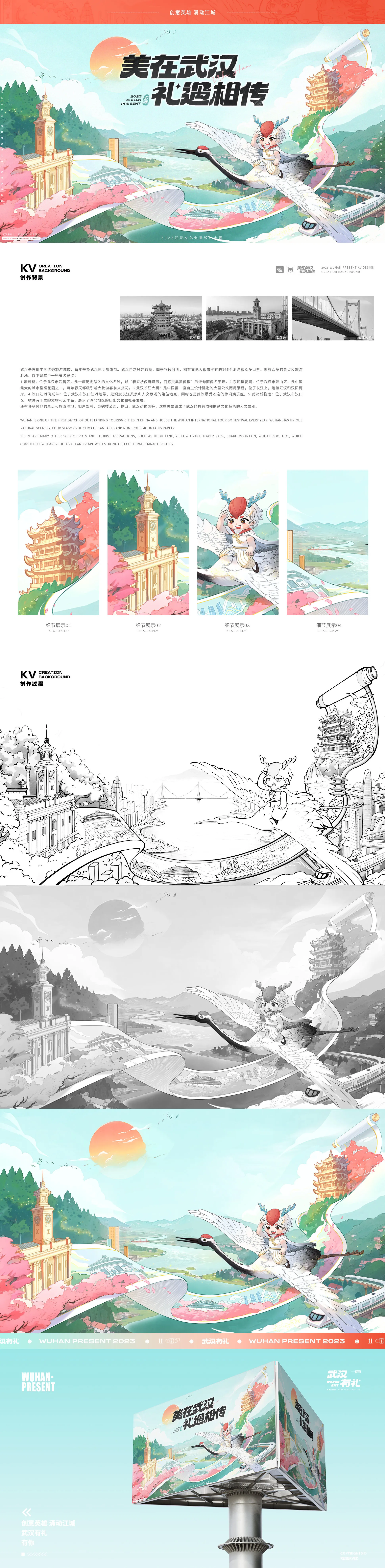 本次視覺方案以【武漢有禮更有你、千翎QianLing、城市文化節】為主要板塊,傳遞正能量,展現武漢市民的熱情友善和包容精神,打造以“武漢有禮”為主題的形象,并將其推廣給更廣泛的受眾群體。以文化節和地標打卡形式充分展示武漢文化的特色和豐富性,促進城市文化發展與推廣。以武漢歷史文化的傳播與解讀,增強居民對城市的歸屬感與自豪感,提升城市形象和知名度,推動文化經濟發展。